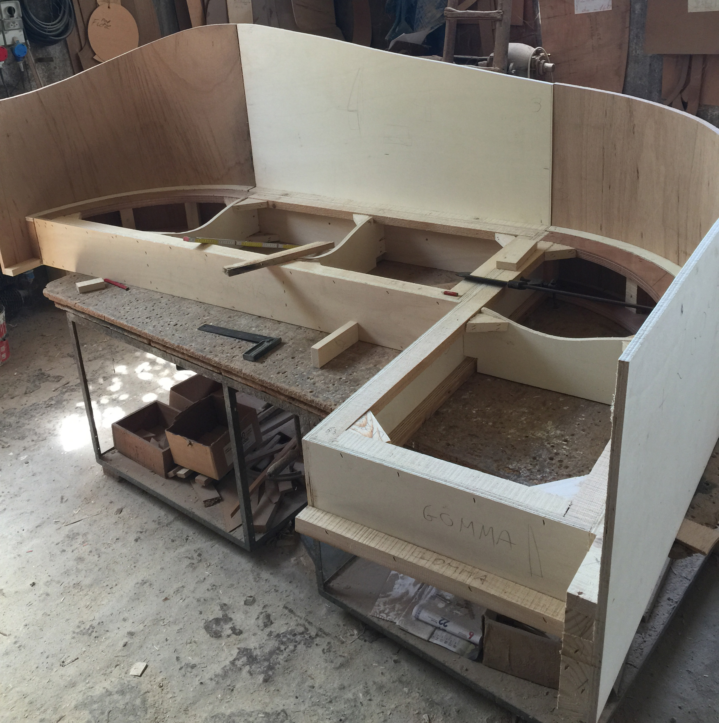 Il progetto è stato perfezionato in alcune parti dal nostro centro studi che ha reso possibile la realizzazione dello scheletro in legno grazie all’utilizzo di pannelli di multiflex, un tipo di multistrati flessibile che si poteva adattare bene alle linee del divano. Successivamente alla realizzazione dello scheletro portante si è ottimizzata l’ergonomia della seduta, resa piacevole grazie all’utilizzo di poliuretani di primissima scelta con densità che variano da 40 kg/m³ a 55 kg/m³ per la parte portante della seduta ed a 25 kg/m³ per la schiena; la seduta inoltre viene completata da uno strato di Memory Foam per renderla ancora più confortevole.