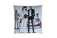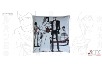 Cuscino family di Lupin arredo dalla forma quadrata con lavorazione vintage raffigurante la realizzazione del sogno di Lupin, sposare Fujiko con Jigen e Goemon come testimoni; l’interno presenta una imbottitura in mollapiuma fatta in piuma fiocco siliconato vergine ed il tutto rivestito in Soft Velvet.